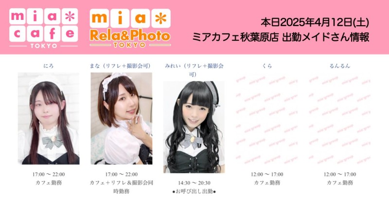 | 営業時間 | 12:00〜22:00(最終受付21:20) 定休日 不定休 深夜営業については、公式ページ右上の深夜営業日案内を ご覧ください(金曜・土曜日を中心に深夜営業予定)。 深夜営業対象日 22:00〜翌朝5:00(最終受付 翌朝4:20) http://market.chu.jp/schedule1/sche37.cgi ミアグループ総合スケジュール(PC&スマホ) http://market.chu.jp/schedule1/sche37.cgi?dm=1 ミアグループ総合スケジュール(ガラケー) 告知日のみ営業となります。告知日以外は深夜営業いたしておりません。 | ||||||||||||||