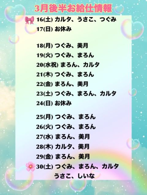 お帰りなさいませ、ご主人様、お嬢様🕊 本日まで✨️私服イベント👗💞 カルタ🩵うさこ💚つぐみ💜 今日はポカポカだねぇ〜🌞 ご帰宅お待ちしております🥴🍻🥴 営業時間 17:00〜22:50 https://t.co/6V58bRA22a