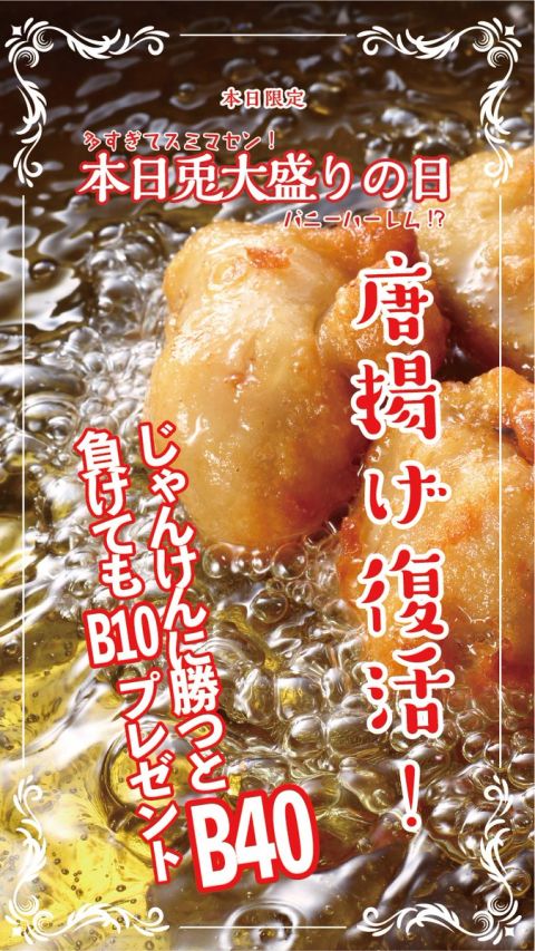 【🐰本日の営業のお知らせ🐰】 本日5月10日営業致しております💁‍♀️ 知ってる方も多くいらっしゃいますと思いますが 「唐揚げバニー」となりました🎉 今回のメニューがこちらとなります👯‍♀️ ↓↓↓↓ ちなみに今日の限定唐揚げは「軟骨の唐揚げ」です🐓 お待ちしております🐇 #中野 #バニー #バイト募集 https://t.co/2JJNflUCmq