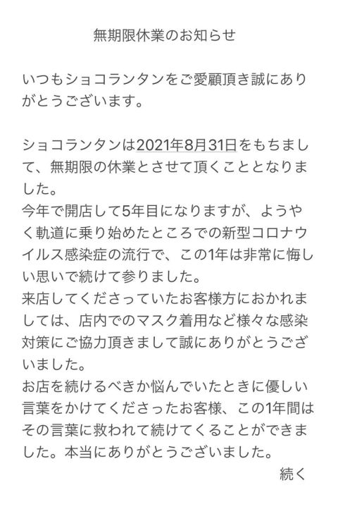 【休業のお知らせ】 新型コロナウイルスの感染拡大、政府の要請などの影響により、2021年9月から休業させて頂くこととなりました。再開は未定です。 https://t.co/NnpsPz1vwo