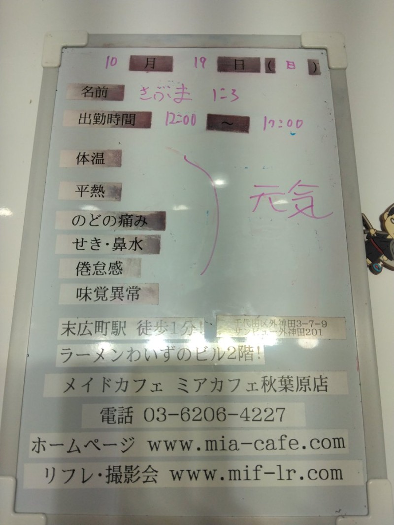| 営業時間 | ●ミアカフェ東京店(メイドカフェ)http://www.mia-cafe.com/ ● □平日 月~金 17:00~22:00 □土曜・日曜・祝日 12:00~22:00 ★定休日 なし(2019年1月より定休日廃止) □ラストオーダー 閉店の60分前 22:00閉店の場合→21:00ラストオーダー 営業日や出勤状況についてはこちら。 http://pandaland.cutegirl.jp/mif/c_cms_csv/sch_top.php ●ミアリラ&フォト東京店(撮影会&リフレ)http://www.mif-lr.com/ ● □全日 12:00〜22:00 ですがリラクゼーション出勤スタッフがいる時間帯のみ営業です。 ★定休日は不定休(出勤スタッフがいる時間帯の営業) □最終受付 閉店の45分前 22:00閉店の場合→21:15(21:50迄に施術時間が終わるコース) ※高校生不可 ●深夜営業については、公式サイト右上の http://market.chu.jp/schedule1/sche37.cgi ミアグループ総合スケジュール(PC・スマホ) http://market.chu.jp/schedule1/sche37.cgi?dm=1 ミアグループ総合スケジュール(ガラ携帯) をご覧ください。告知日のみ営業となります。告知日以外は深夜営業いたしておりません。 深夜営業対象日 22:00〜翌朝5:00(L.O.4:00) | ||||||||||||||