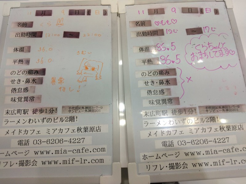 | 営業時間 | ●ミアカフェ東京店(メイドカフェ)http://www.mia-cafe.com/ ● □平日 月~金 17:00~22:00 □土曜・日曜・祝日 12:00~22:00 ★定休日 なし(2019年1月より定休日廃止) □ラストオーダー 閉店の60分前 22:00閉店の場合→21:00ラストオーダー 営業日や出勤状況についてはこちら。 http://pandaland.cutegirl.jp/mif/c_cms_csv/sch_top.php ●ミアリラ&フォト東京店(撮影会&リフレ)http://www.mif-lr.com/ ● □全日 12:00〜22:00 ですがリラクゼーション出勤スタッフがいる時間帯のみ営業です。 ★定休日は不定休(出勤スタッフがいる時間帯の営業) □最終受付 閉店の45分前 22:00閉店の場合→21:15(21:50迄に施術時間が終わるコース) ※高校生不可 ●深夜営業については、公式サイト右上の http://market.chu.jp/schedule1/sche37.cgi ミアグループ総合スケジュール(PC・スマホ) http://market.chu.jp/schedule1/sche37.cgi?dm=1 ミアグループ総合スケジュール(ガラ携帯) をご覧ください。告知日のみ営業となります。告知日以外は深夜営業いたしておりません。 深夜営業対象日 22:00〜翌朝5:00(L.O.4:00) | ||||||||||||||