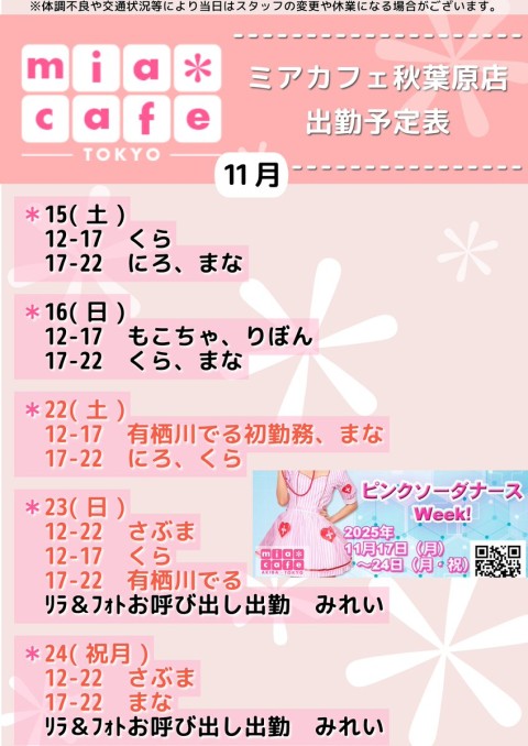 ★メイドカフェ・ミアカフェ #秋葉原 店★ ☕️営業予定日☕️ 🎀11月15日(土)  12-17 くら  17-22 にろ,まな 🎀11月16日(日)  12-17 もこちゃ,りぼん  17-22 くら,まな 🩺ピンクソーダ #ナース ウィーク🩺 💗11月22日(土)  12-17 有栖川でる【初お給仕】,まな  17-22 にろ,くら #看護婦 https://t.co/wn7YZPv1Sy