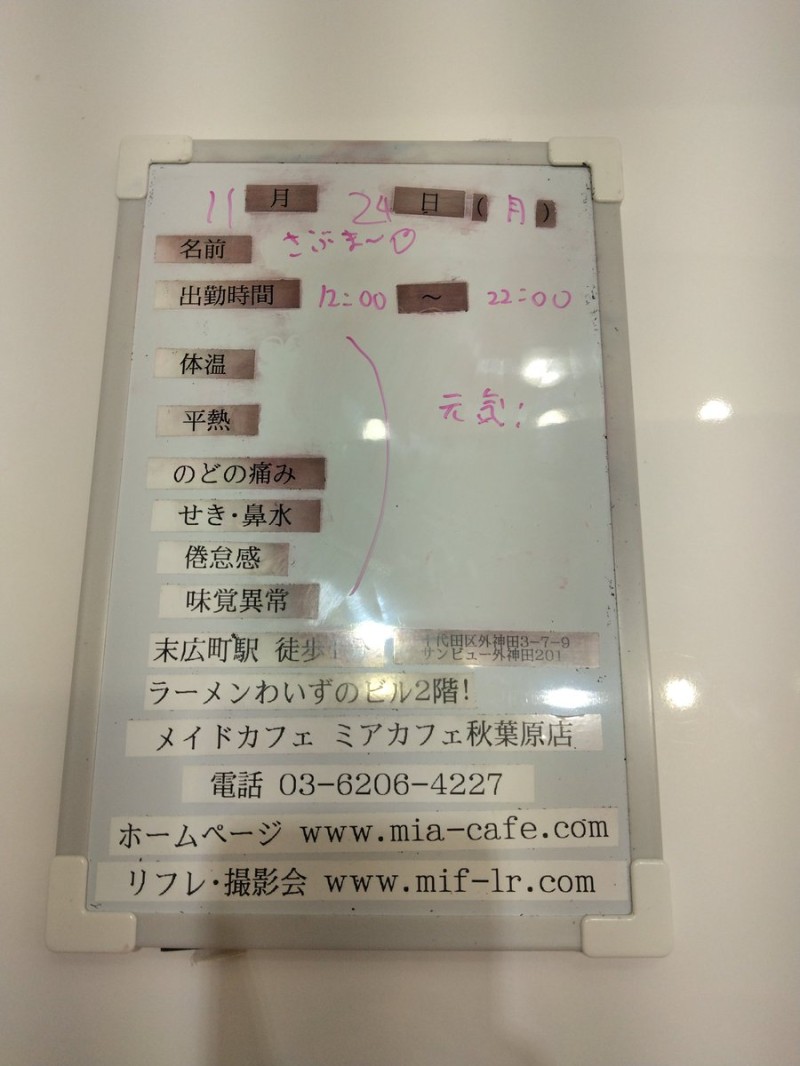 | 営業時間 | ●ミアカフェ東京店(メイドカフェ)http://www.mia-cafe.com/ ● □平日 月~金 17:00~22:00 □土曜・日曜・祝日 12:00~22:00 ★定休日 なし(2019年1月より定休日廃止) □ラストオーダー 閉店の60分前 22:00閉店の場合→21:00ラストオーダー 営業日や出勤状況についてはこちら。 http://pandaland.cutegirl.jp/mif/c_cms_csv/sch_top.php ●ミアリラ&フォト東京店(撮影会&リフレ)http://www.mif-lr.com/ ● □全日 12:00〜22:00 ですがリラクゼーション出勤スタッフがいる時間帯のみ営業です。 ★定休日は不定休(出勤スタッフがいる時間帯の営業) □最終受付 閉店の45分前 22:00閉店の場合→21:15(21:50迄に施術時間が終わるコース) ※高校生不可 ●深夜営業については、公式サイト右上の http://market.chu.jp/schedule1/sche37.cgi ミアグループ総合スケジュール(PC・スマホ) http://market.chu.jp/schedule1/sche37.cgi?dm=1 ミアグループ総合スケジュール(ガラ携帯) をご覧ください。告知日のみ営業となります。告知日以外は深夜営業いたしておりません。 深夜営業対象日 22:00〜翌朝5:00(L.O.4:00) | ||||||||||||||