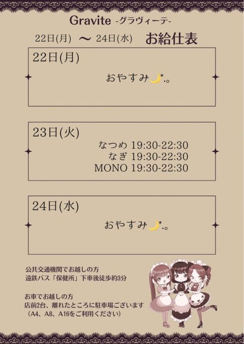 今週のお給仕予定です🌟 ご主人様、お嬢様のご帰宅をお待ちしております❕ 🚨日によってOPENの時間が異なりますのでご注意ください また、準備中になっている日の情報は追ってお伝えいたします🙇‍♀️ #グラヴィーテ #メイドカフェ #メイド喫茶 #コンカフェ #浜松 #豊橋 https://t.co/a74iikLPPu