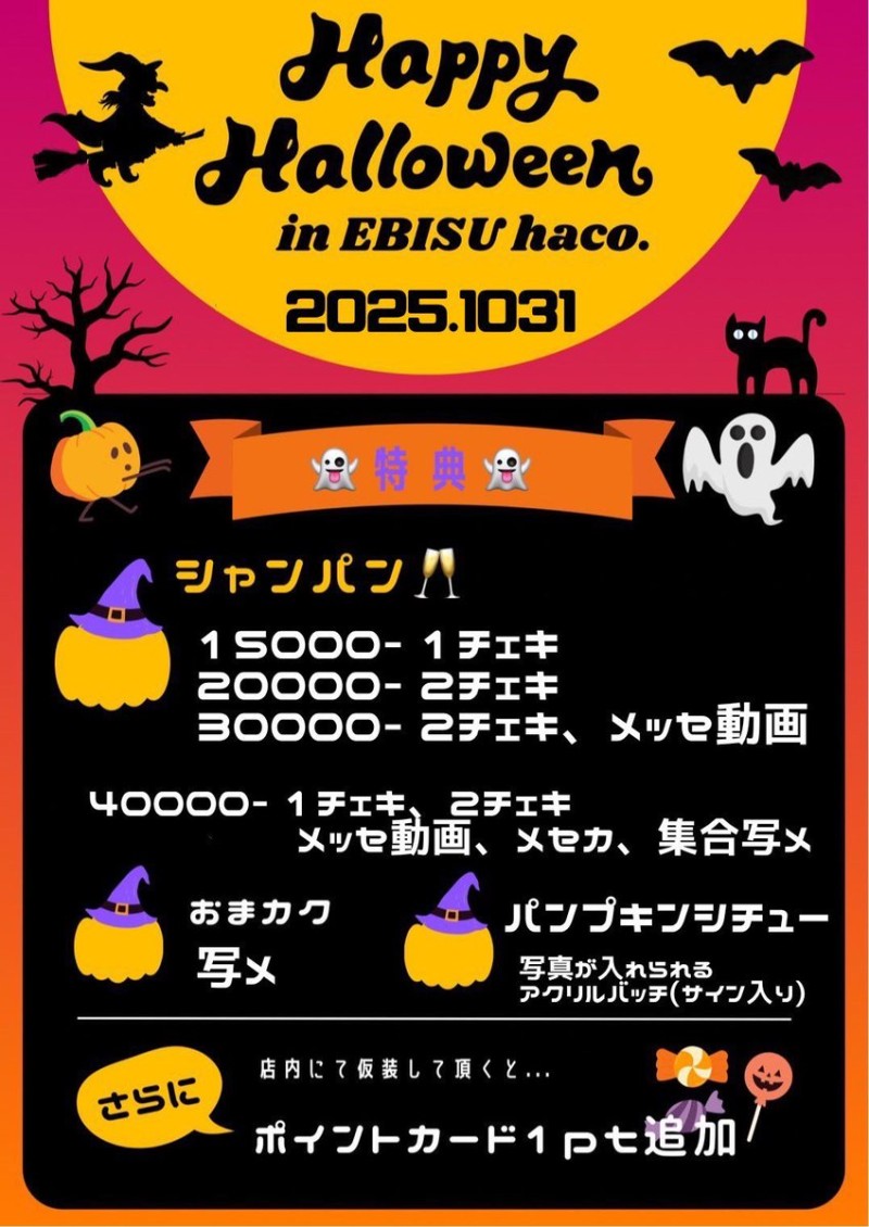 2025年10月31日(金) 恵比寿 男装cafe&bar haco. 👻ハロウィンイベント🎃 ⏰ 20:00-5:00 ♦︎バーテンダー♦︎ 善 樹 怜 瑠快(-23:30) ご来店お待ちしております! #男装 #男装喫茶 #男装カフェ https://t.co/RBFP0RaO25