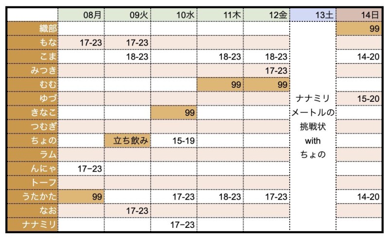 #気絶と昭和99年のお出迎え予定 8(月)から14(日)までのお出迎え予定です! 13(土)は通常営業をお休みして、99年でナナミリのイベントあるよん! 詳しくは引用をチェック! https://t.co/uKCL33Pcrs
