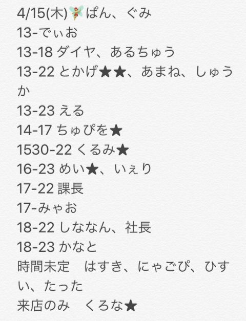 4/15(木) ♦️緊急事態宣言明け♦️大感謝祭♦️4月まで延長決定🙆‍♀️ 常連様はスペシャルガチャサービス‼️ ご新規さんは5500円相当🤑🤑🤑 お久しぶりさんは10500円相当⁉️⁉️ ↓シフトは画像参照↓ https://t.co/NbRIMtIIUI