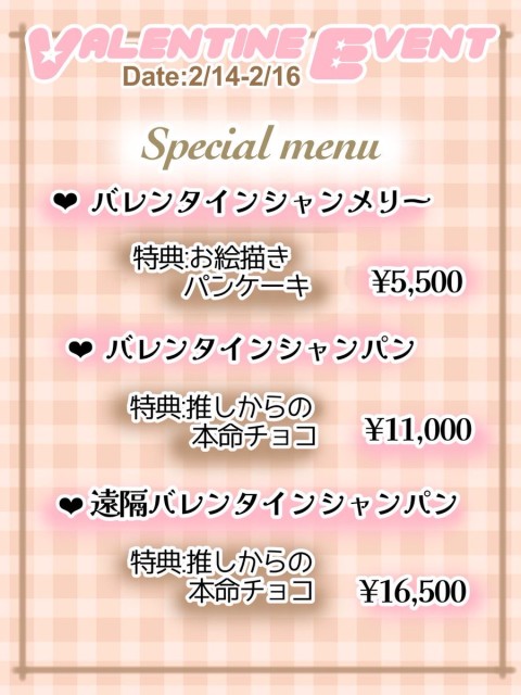 🍫お知らせ💝 2月14日から2月16日の3日間、バレンタインイベントを予定しております!💌 期間中はキャストたちが特別な衣装でお出迎え❕限定メニューもご用意しております^> ·̫ <^🤎♩ バレンタインシャンパンはご予約頂くとスムーズです!希望キャストにご連絡お願いします❕ https://t.co/sRuQ4Vk2PH