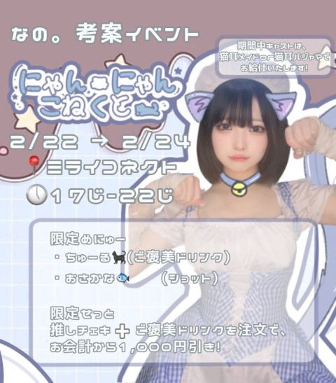 2025.2.22 (土)🐾 ✧••┈┈┈┈┈┈••✧ 15-19 ふう 17-22 なの 19-22 にこ さとう 22-26 モカ やよい ✧••┈┈┈┈┈┈••✧ 本日は、にゃんにゃんこねくと̳- ·̫ - ̳ˆ ♡ ねこちゃんになってお待ちしております🎀 https://t.co/KDq3L4UCs2