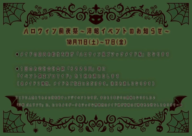 こんにちは♬ 本日の営業日時は【10月12日】【12:00〜22:00】 お留守番メイドは 🌙まりあ 🌙りりな(〜16) 🌙つばめ(15〜) でございます♬ ハロウィン風ゴシックメイド服でご帰宅お待ちしております☺️🦇❤️ https://t.co/Vv9zufuv27