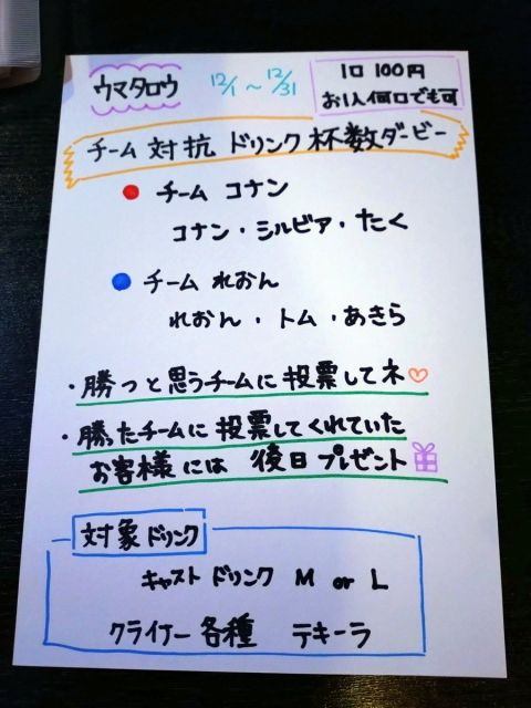 | 営業時間 | 火曜日〜土曜日 19:00〜5:00 | ||||||||||||||
